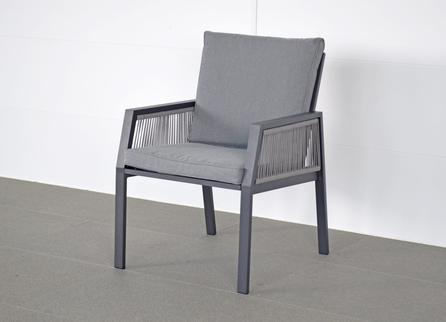 Crafted with both comfort and durability in mind, the Bettina chair features a sturdy powder-coated aluminium frame that offers reliable support while remaining lightweight and rust-resistant. The pale grey cushions are showerproof and soft to the touch, providing extra comfort and a contemporary look that complements any garden setting.