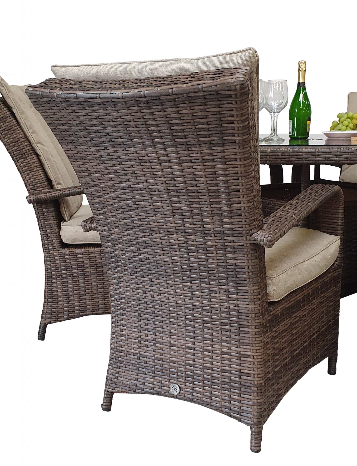 Designed to blur the line between indoors and out, this rattan garden furniture set pairs a generously sized round dining table with six extra-high-back chairs, creating the comfort of a traditional dining suite under a sky-high ceiling of blue. The lightly brushed brown weave echoes natural willow tones, while the clean, modern profile slips effortlessly into cottage courtyards, contemporary terraces, and everything in between. From sunny barbecues to festive winter gatherings, Florence is built to keep you cosy and connected all year round.