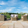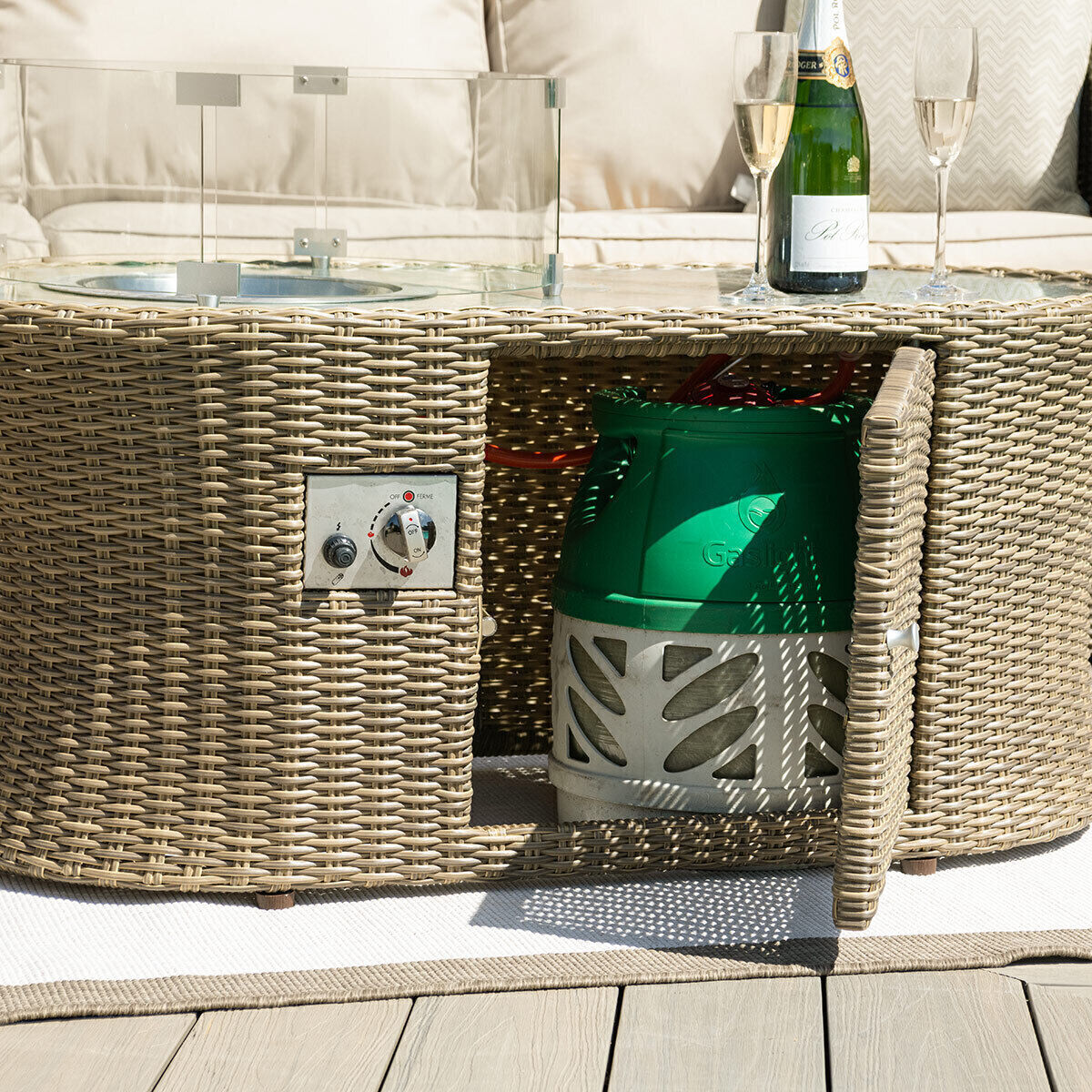 The Winchester 2 Seat Sofa Set with Firepit by Homeflair includes an opulent two seat sofa combined with a matching pair of armchairs and a warming oval shaped fire pit coffee table. This set is recognised for its signature curved arms and backs. The Fire Pit Coffee Table is perfect for use on cooler evenings to provide warmth late into the night for you and your guests. All our fire pit systems will accommodate a 5kg green patio gas bottle which can be stored underneath the table. We anticipate each gas bottle will last for approximately 6-7 hours.