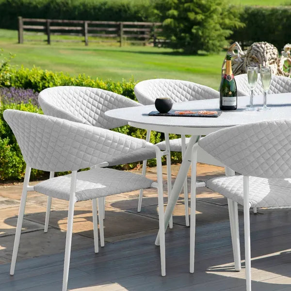 The Homeflair Pebble Dining Collection effortlessly blends luxurious comfort with smart functionality. Available in 6-seat and 8-seat configurations with both oval and rectangular table options, this collection is defined by its opulent design and practicality. Each chair features a generously filled base and quilted back cushion that adds depth, elegance, and personality to your outdoor setting. Thoughtfully designed for convenience, all chairs are fully stackable, making storage and transport a breeze.