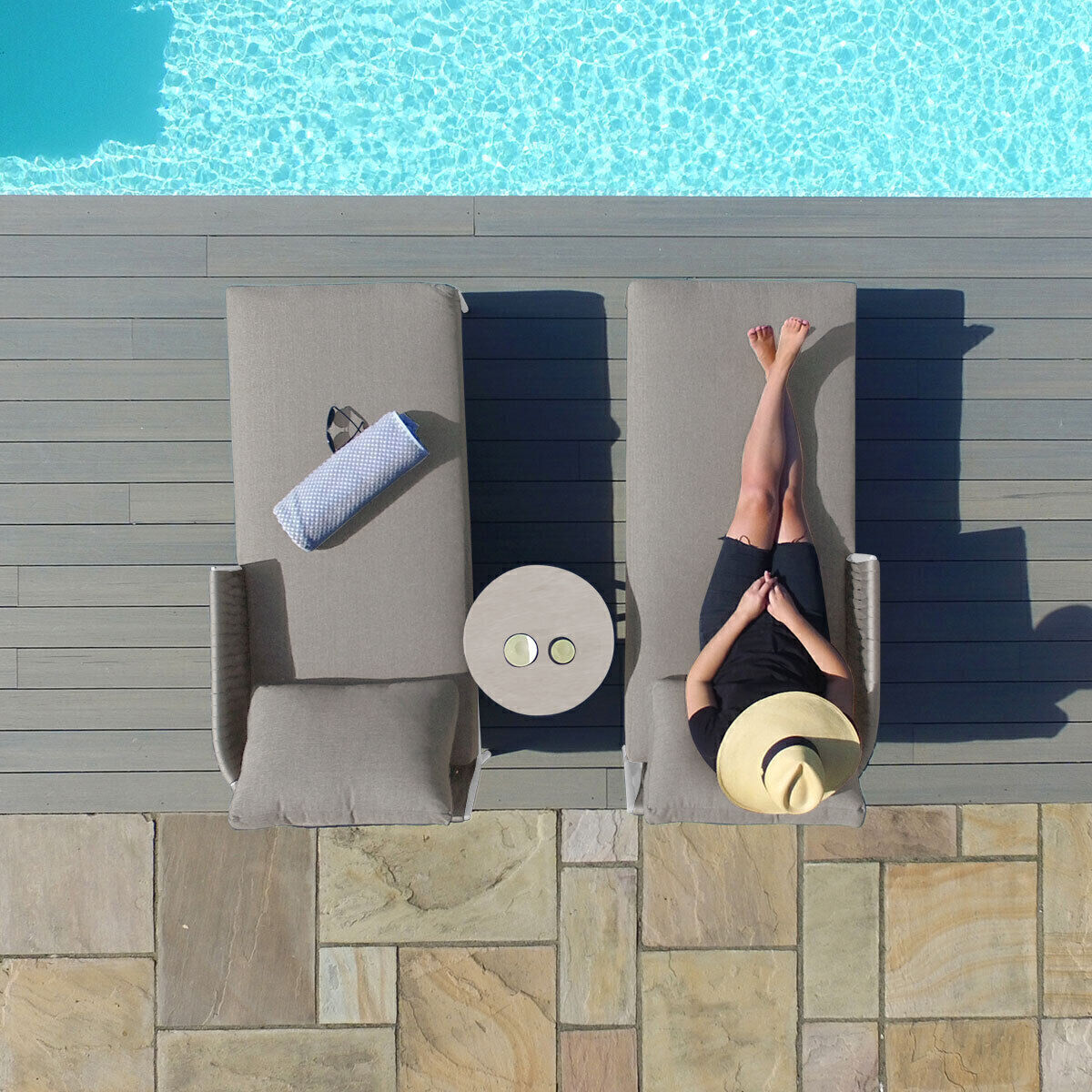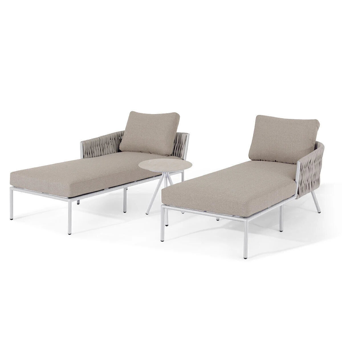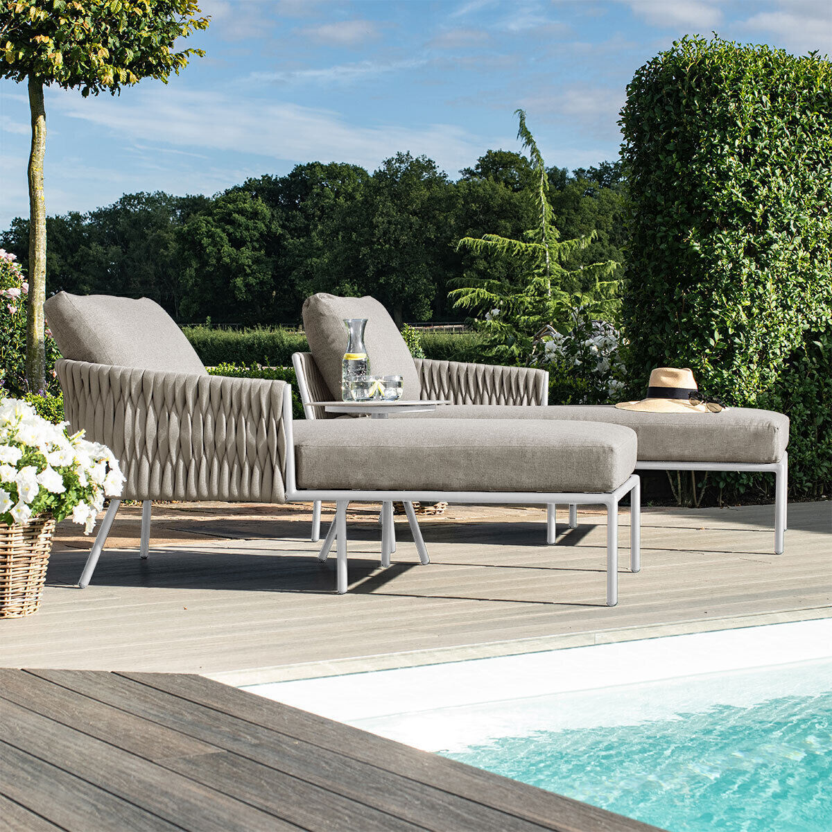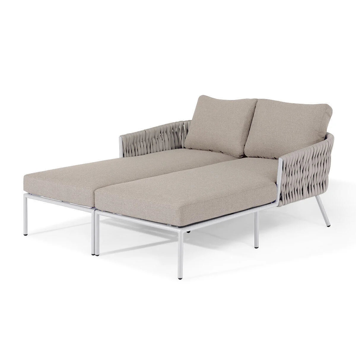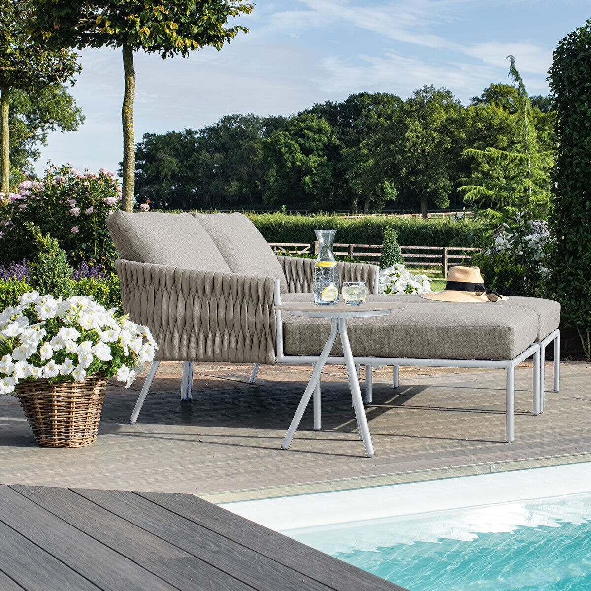 Handcrafted from outdoor rope fabric, our Marina Double Sun Lounger Set will dress your outdoor space beautifully. The Homeflair Marina Double Sun lounger has been ergonomically shaped from a substantial aluminium frame for ultimate stability and laced with a thick rope weave. This unique looking sandstone sun lounger can be split into separate loungers, or alternatively into a double sun lounger. The side table offers elegance with its ceramic effect tempered glass and the high-quality cushioning provides essential comfort for lounging. The Marina Sandstone cushions are made from polyester which is shower resistant. We advise storing them indoors when not in use.