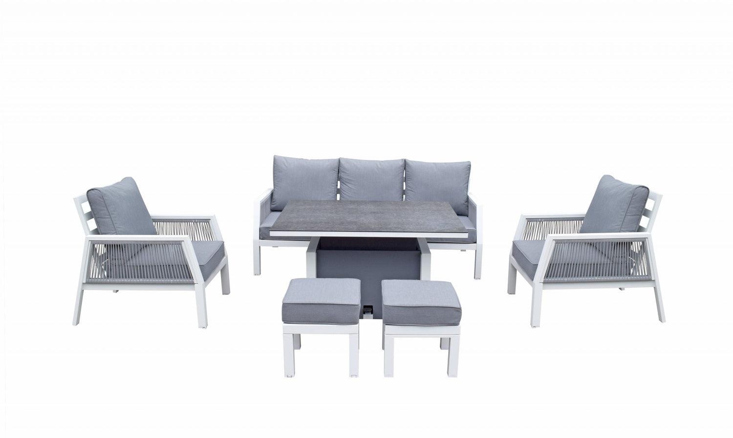 The Bettina set includes 1 three-seater sofa, 2 single armchairs, and a stylish lift table—complete with seat and back cushions for all items.