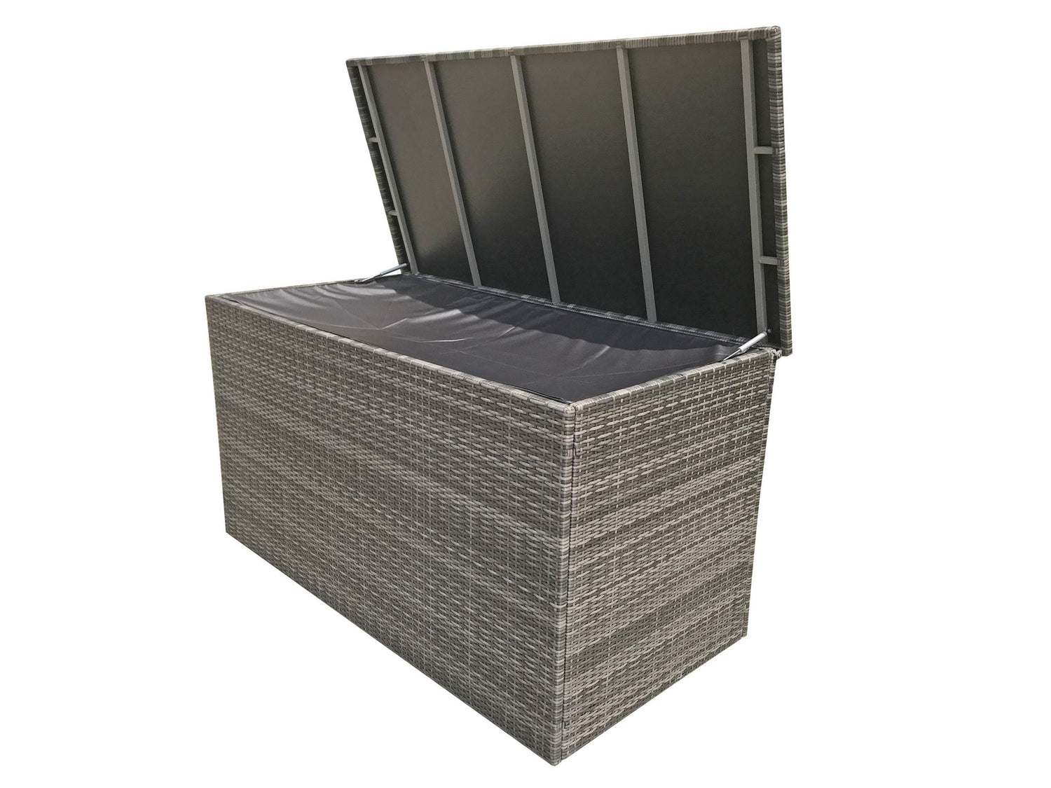 Hand-woven from 8 mm flat-profile polyrattan in an on-trend grey tone, the box mirrors the texture and colour of modern garden sets, so it looks like a coordinated piece rather than an after-thought. Beneath the weave sits a powder-coated frame that shrugs off rust and corrosion, giving you a storage solution built to last through British summers and drizzly winters alike. Thanks to the UV-stable fibres, the colour stays true season after season ─ no fading, no flaking, just effortlessly tidy patio living.
