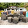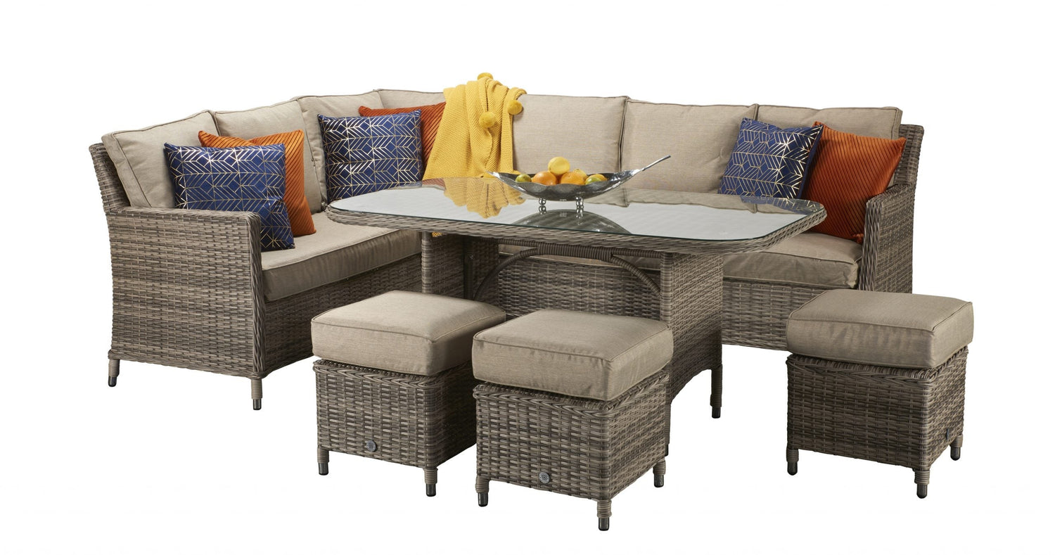 Crafted from mixed grey PE rattan over sturdy aluminium frames, the Edwina set blends style with substance. Its modern grey-brown finish pairs beautifully with pale grey fabric cushions, offering a neutral aesthetic that complements any outdoor décor. Whether you're hosting dinner under the stars or enjoying a peaceful morning coffee, this spacious rattan corner dining set delivers unmatched comfort and versatility.