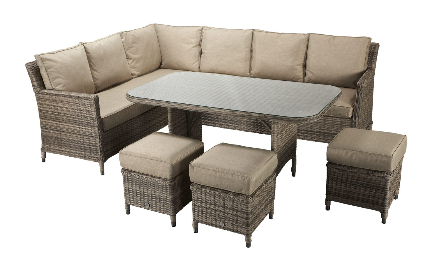 The highlight of this set is its generous seating capacity. With a large corner sofa and three ottoman stools, it comfortably accommodates up to nine guests — making it the perfect choice for family gatherings or garden parties. The integrated 130cm rectangular dining table features a toughened glass top with rounded corners, offering a safe, stylish, and easy-to-clean surface for meals, drinks, and décor.
