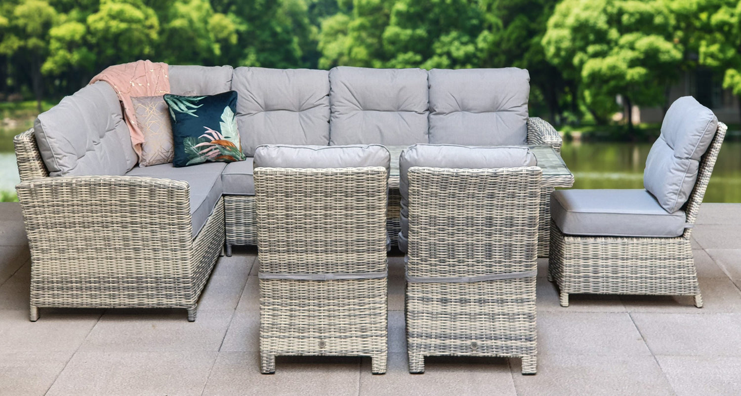 Crafted from light grey rattan with a natural wicker texture, the Amy set creates a fresh, laid-back feel for summer lounging or al fresco meals. The cleverly designed layout includes a corner sofa, three armless chairs, and a spacious tempered glass-top table — ideal for outdoor dining, family gatherings, or a peaceful morning coffee. This modular set adapts to your space, offering flexible arrangement options for patios, balconies, or garden decking.