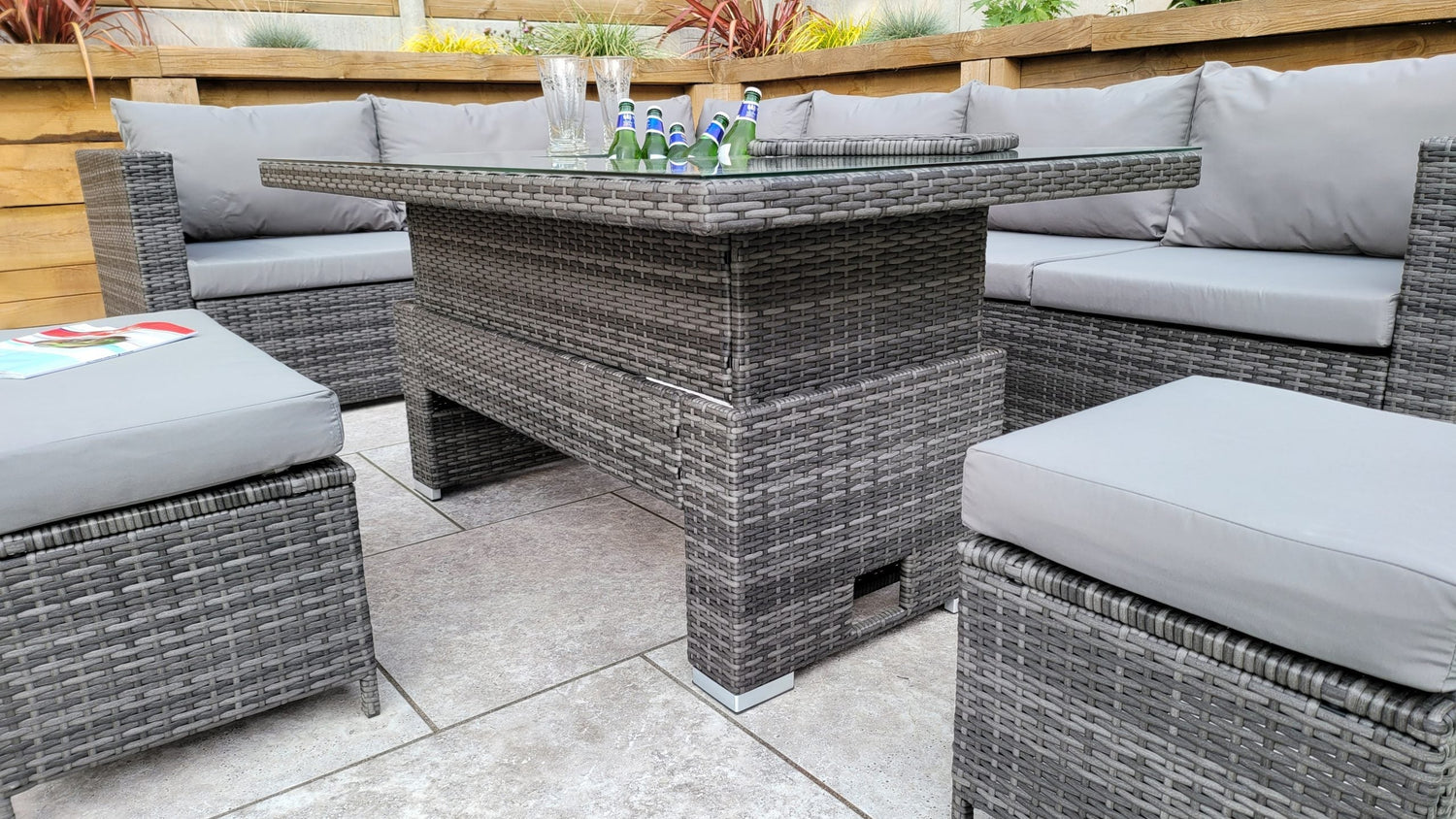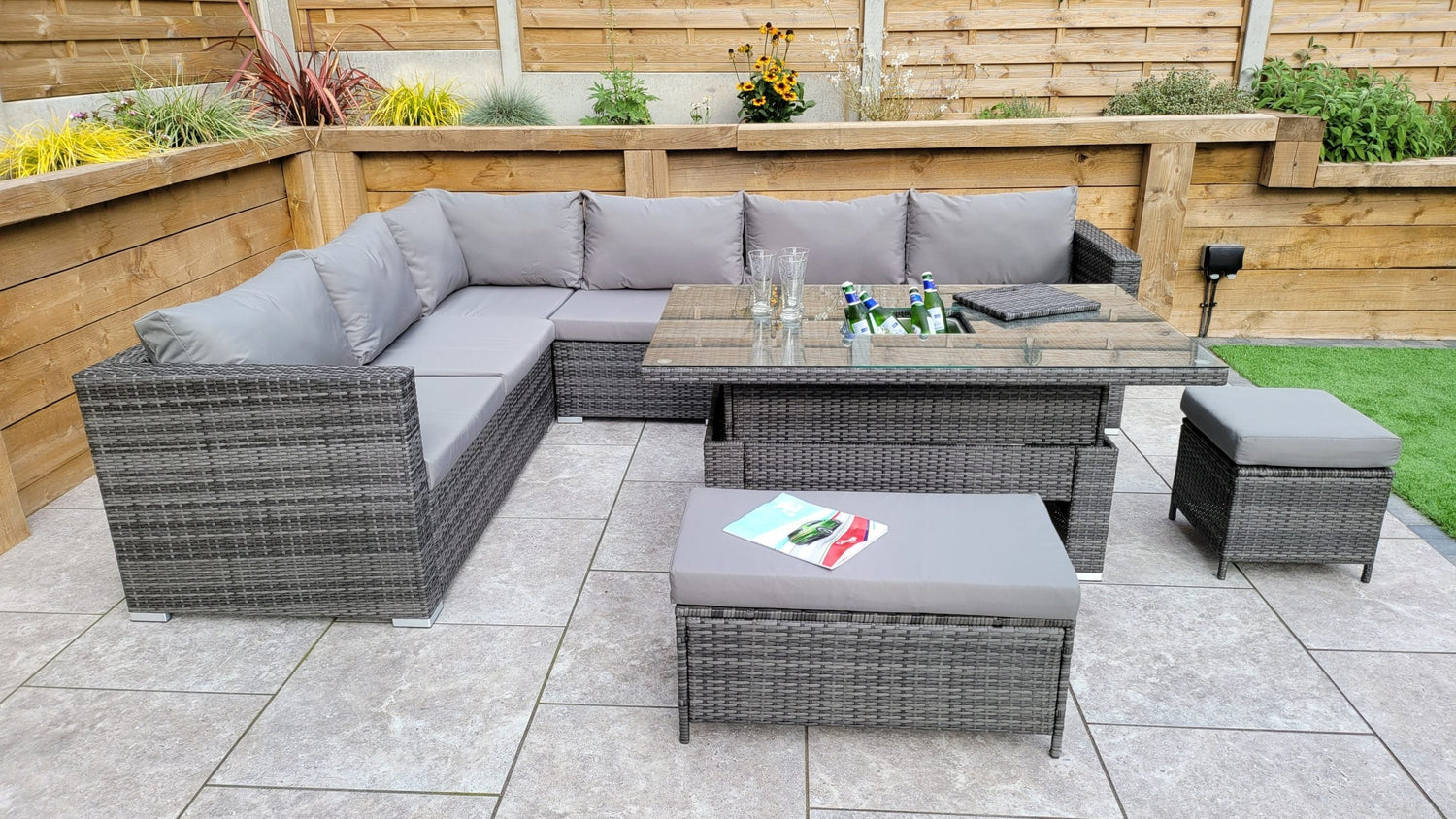 This set includes a corner sofa, a height-adjustable lift table with a built-in ice bucket, and padded cushions for complete comfort and functionality.