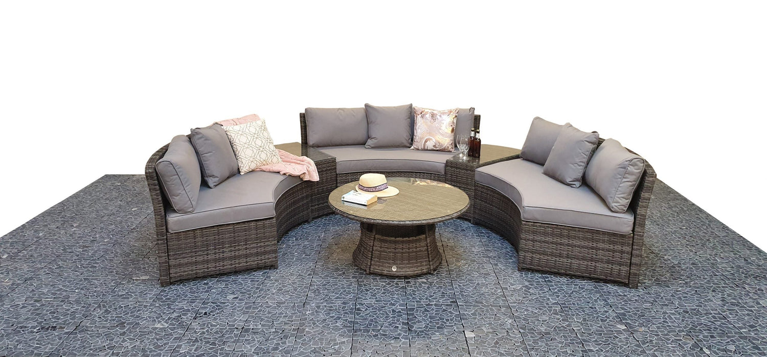 Create a timeless outdoor sanctuary with the Rattan Juliet Half Moon + Middle Table Dining Set in Grey — an elegant and inviting centrepiece built for relaxing, entertaining, and making the most of warm days and cosy evenings. With its unique semi-circle design and practical central table, this set offers a stylish combination of form, function, and outdoor comfort.