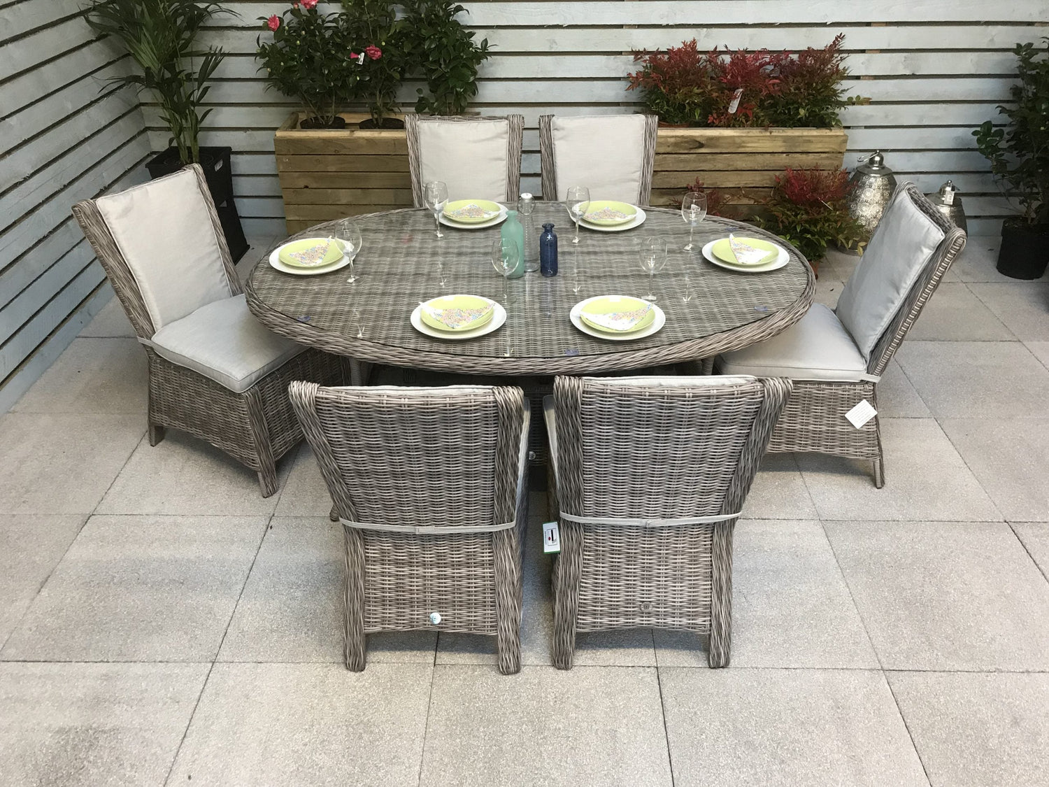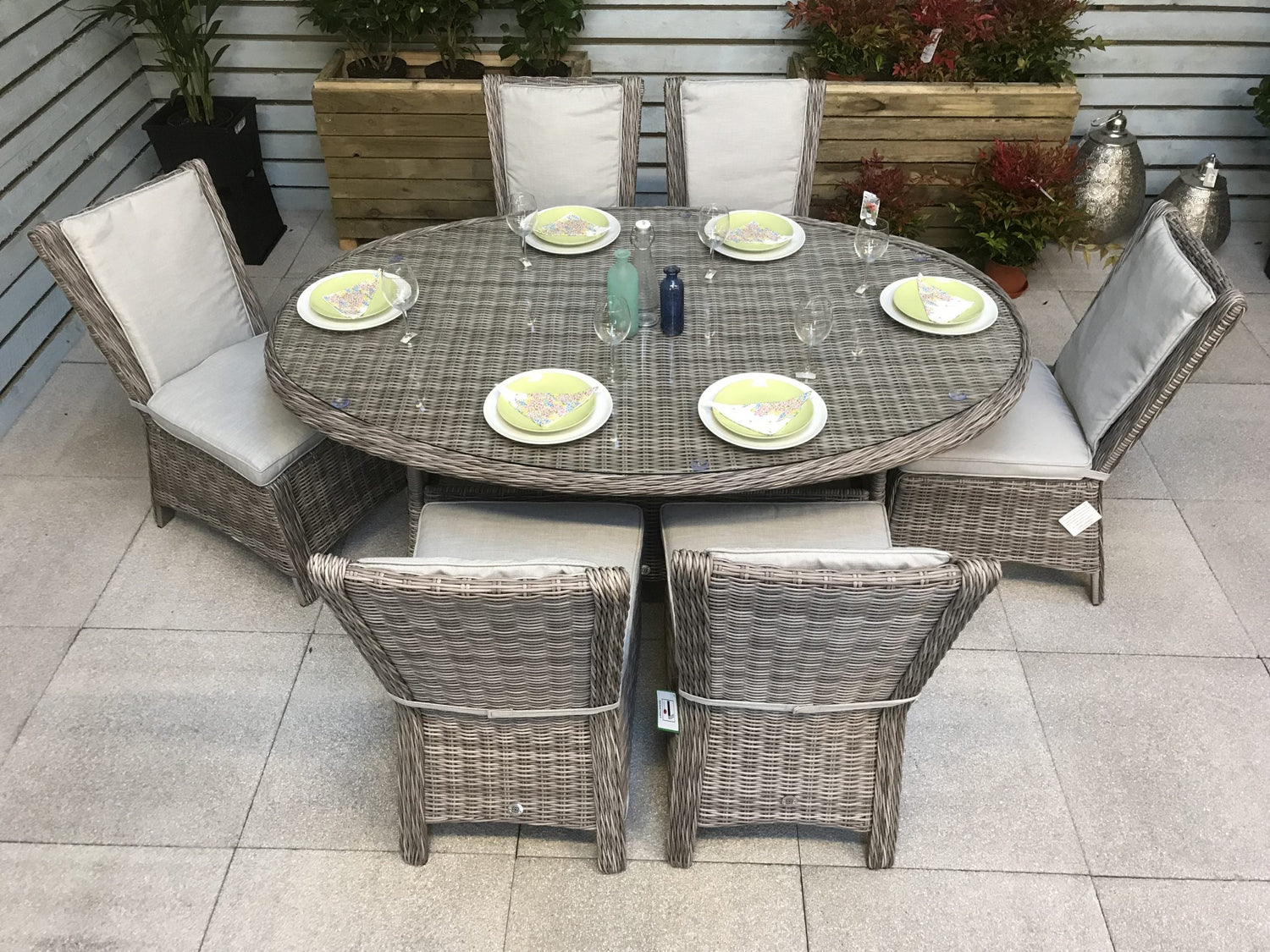 Crafted in a chic light grey rattan weave and supported by a sturdy aluminium frame, this dining set is built for long-lasting performance in all weather conditions. The 180cm x 120cm oval table comfortably accommodates eight guests, offering plenty of room for relaxed outdoor meals or lively summer gatherings. Its 5mm toughened safety glass tabletop adds a sleek, durable finish that’s easy to clean and built to endure the elements.