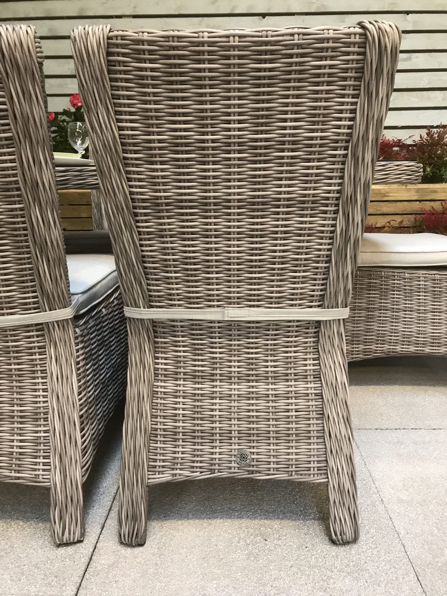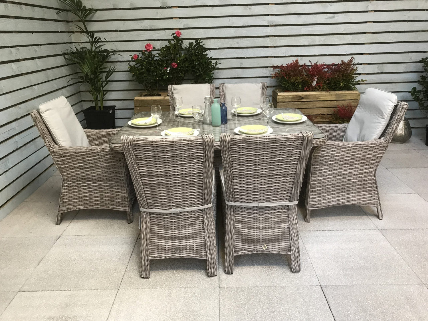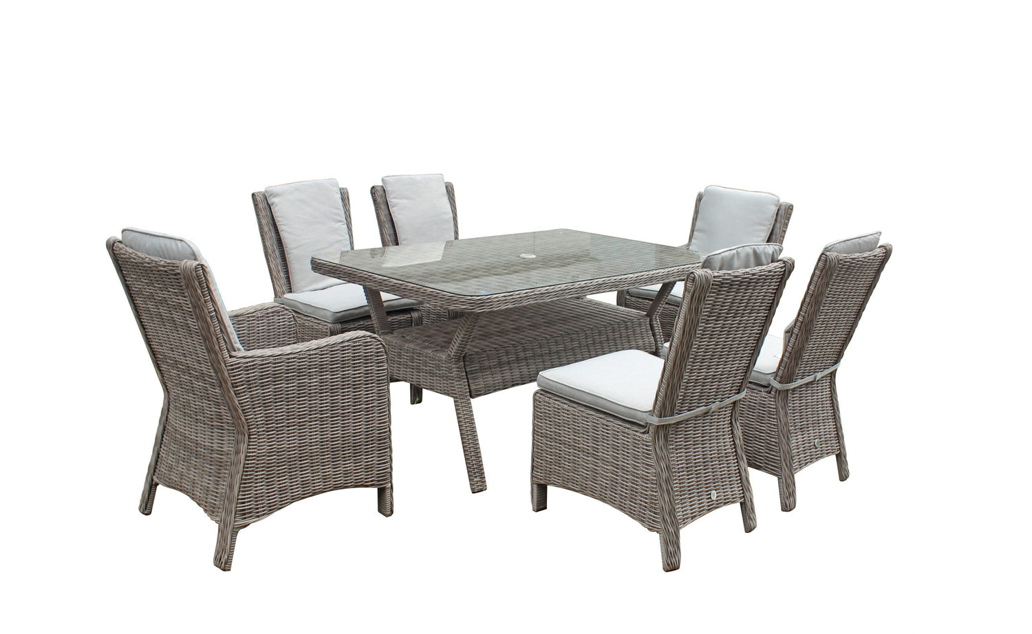 Expertly crafted for year-round use, the Alexandra dining set features a rectangular 150cm x 100cm dining table accompanied by six chairs — four armless and two with armrests — all beautifully finished in a contemporary grey rattan weave. The chairs include high backrests and padded, water-resistant cushions that offer superb comfort and support, ideal for long, leisurely meals.