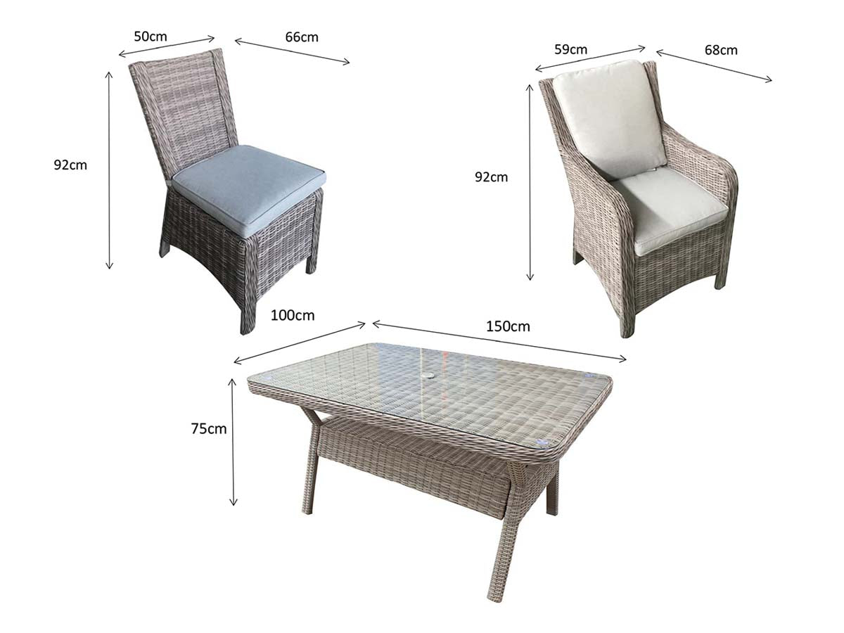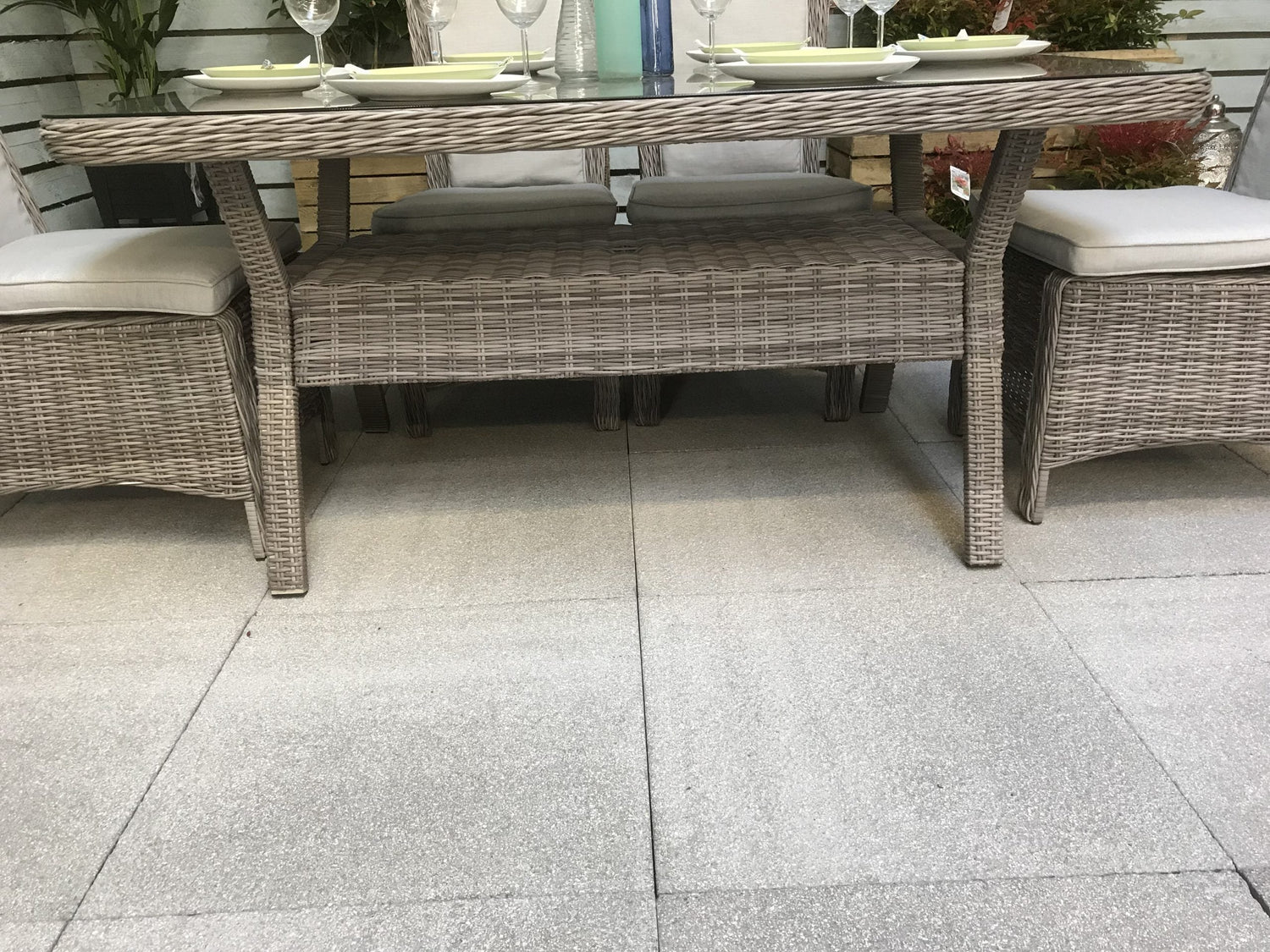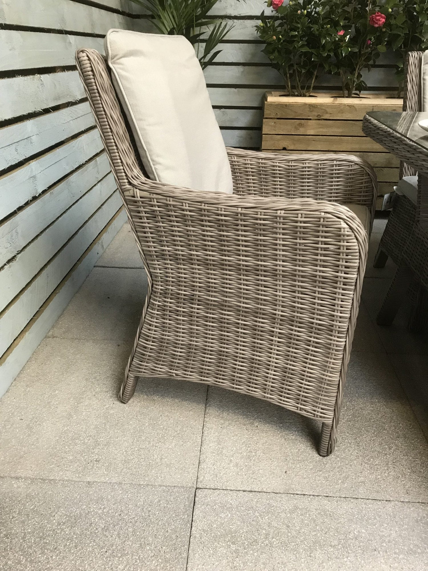 Expertly crafted for year-round use, the Alexandra dining set features a rectangular 150cm x 100cm dining table accompanied by six chairs — four armless and two with armrests — all beautifully finished in a contemporary grey rattan weave. The chairs include high backrests and padded, water-resistant cushions that offer superb comfort and support, ideal for long, leisurely meals.