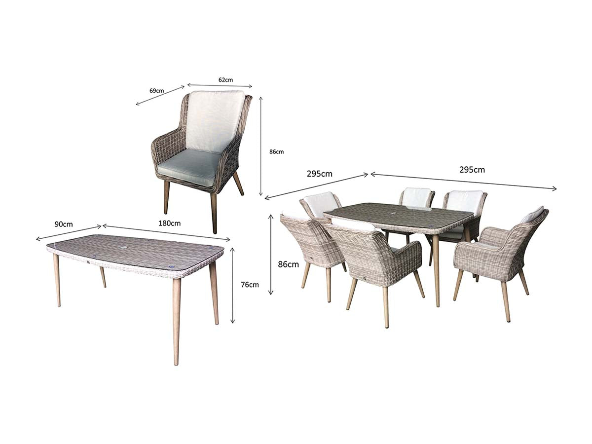 Sink into the generously sized armchairs, designed with supportive backrests and padded cushions covered in fade-resistant, zip-off fabric — easy to clean and made to last. The large 180cm rectangular table features a sleek toughened glass tabletop, adding a contemporary finish while being sturdy enough for everyday use.