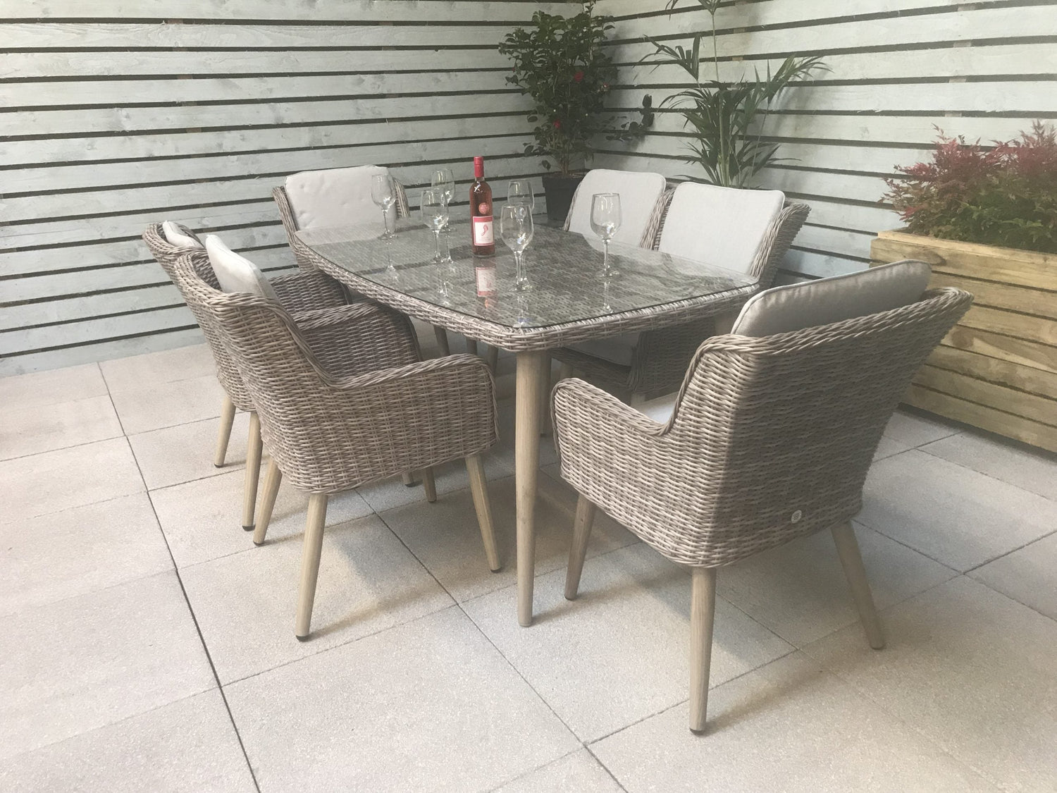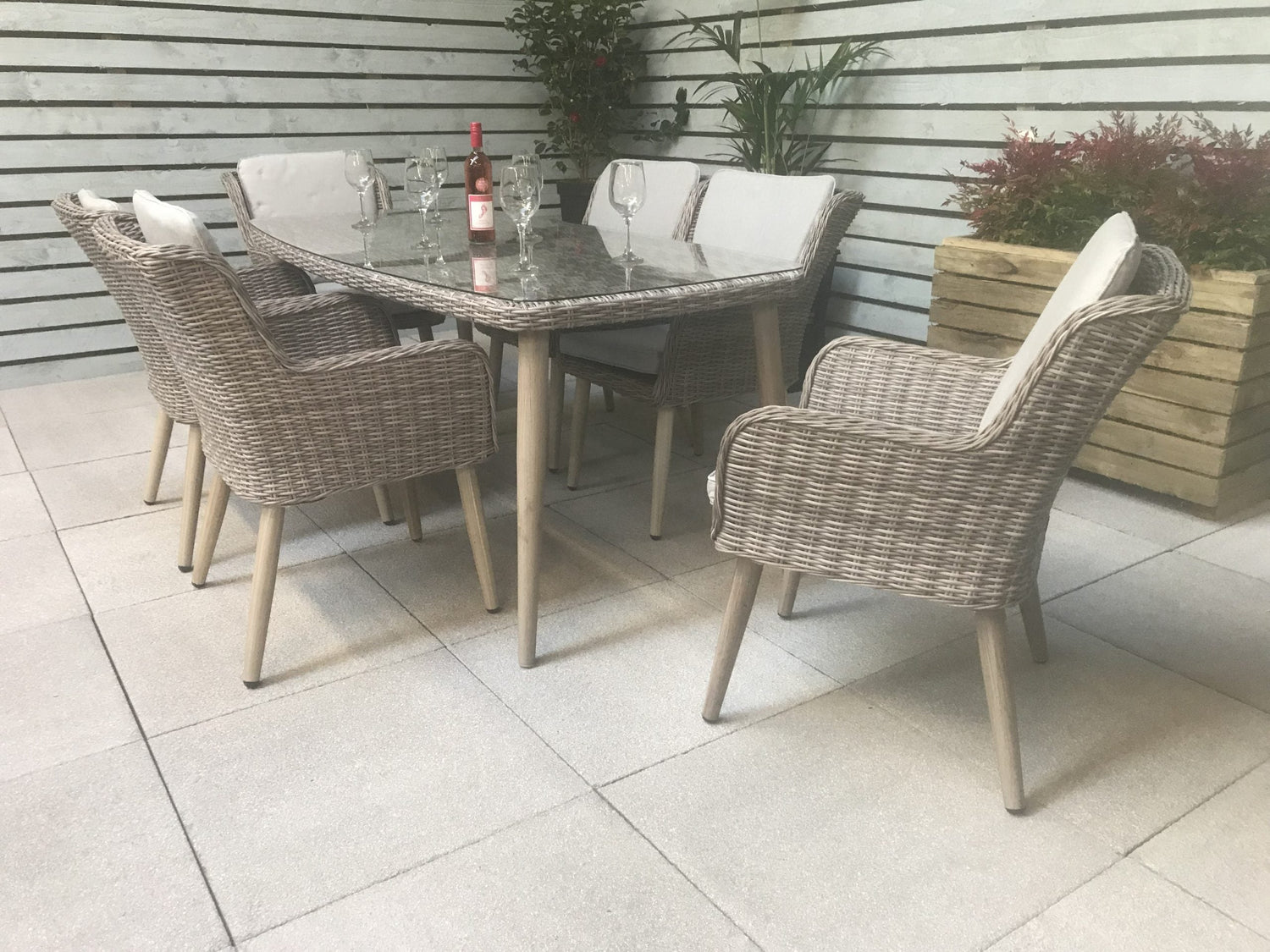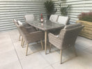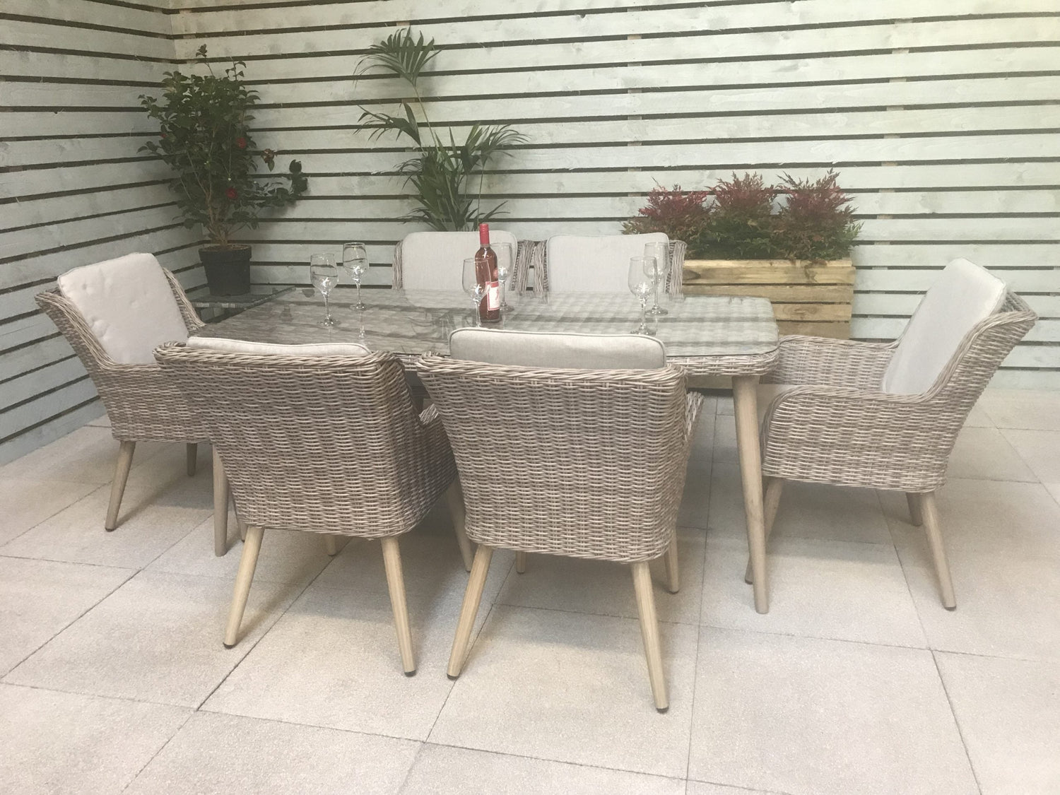 Bring timeless elegance and comfort to your outdoor dining space with the Danielle Rectangular Dining Set. This beautifully crafted rattan rectangular dining table and 6 chairs set is designed for those who appreciate style, practicality, and long-lasting durability. With its pale grey woven rattan and plush cushions, this set transforms any garden or patio into a chic space perfect for alfresco meals, morning coffees, or late-night drinks.